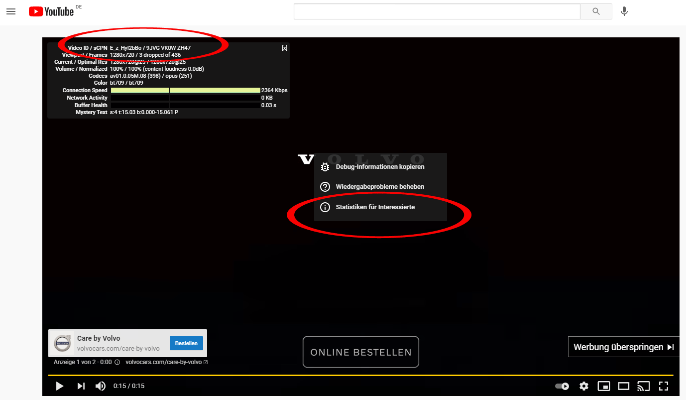 Am PC klickt man mit der rechten Maustaste in das Video und ein Menü öffnet sich. Unter „Statistik für Interessierte“ finde man nun die Video-ID des Werbeclips.
